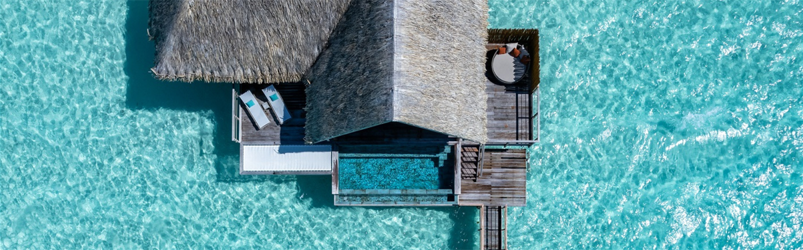 The End of Pontoon Overwater Suite with Pool welcomes you in a space of 170 m2, overlooking the magnificent lagoon of Bora Bora and facing the majestic Mount Otemanu.
